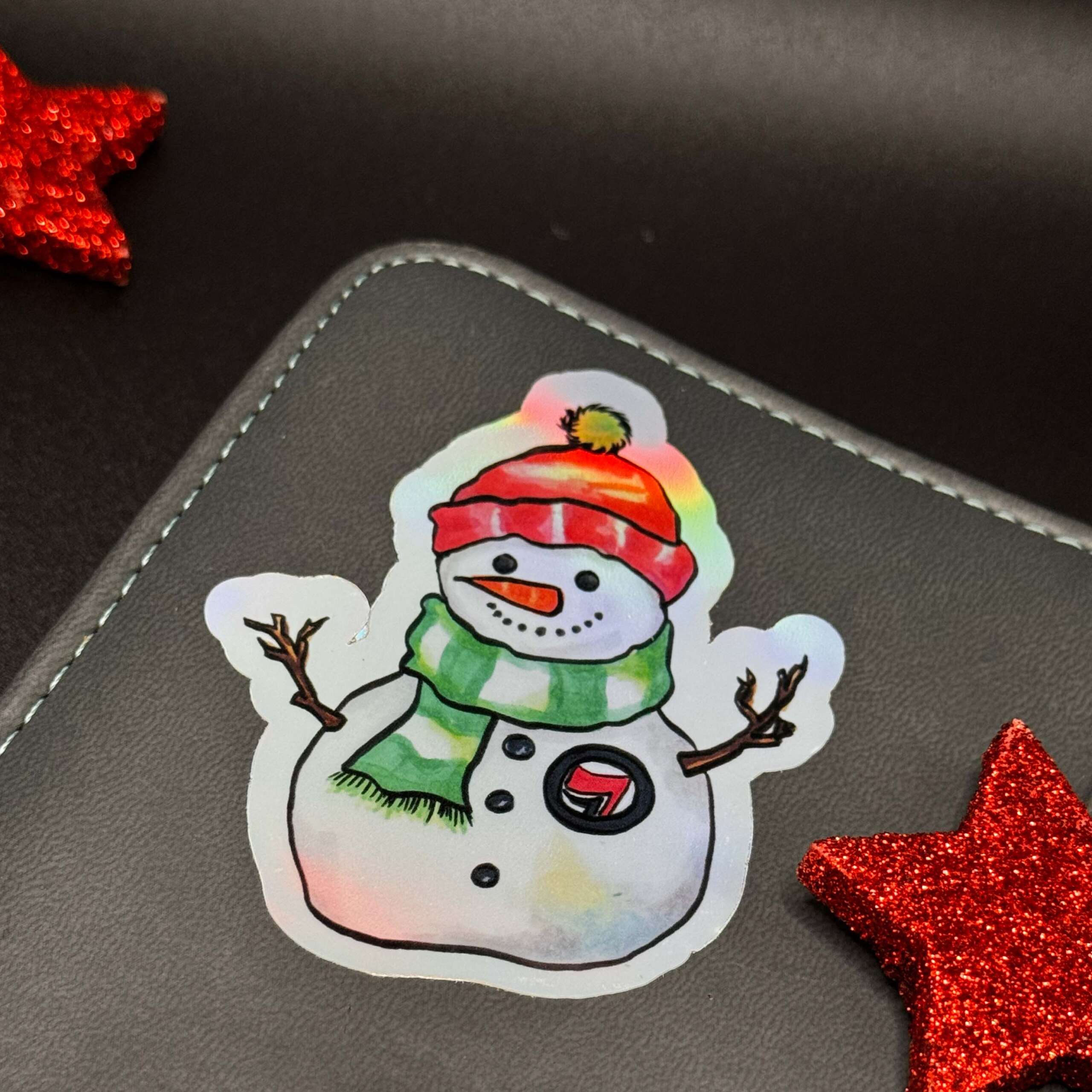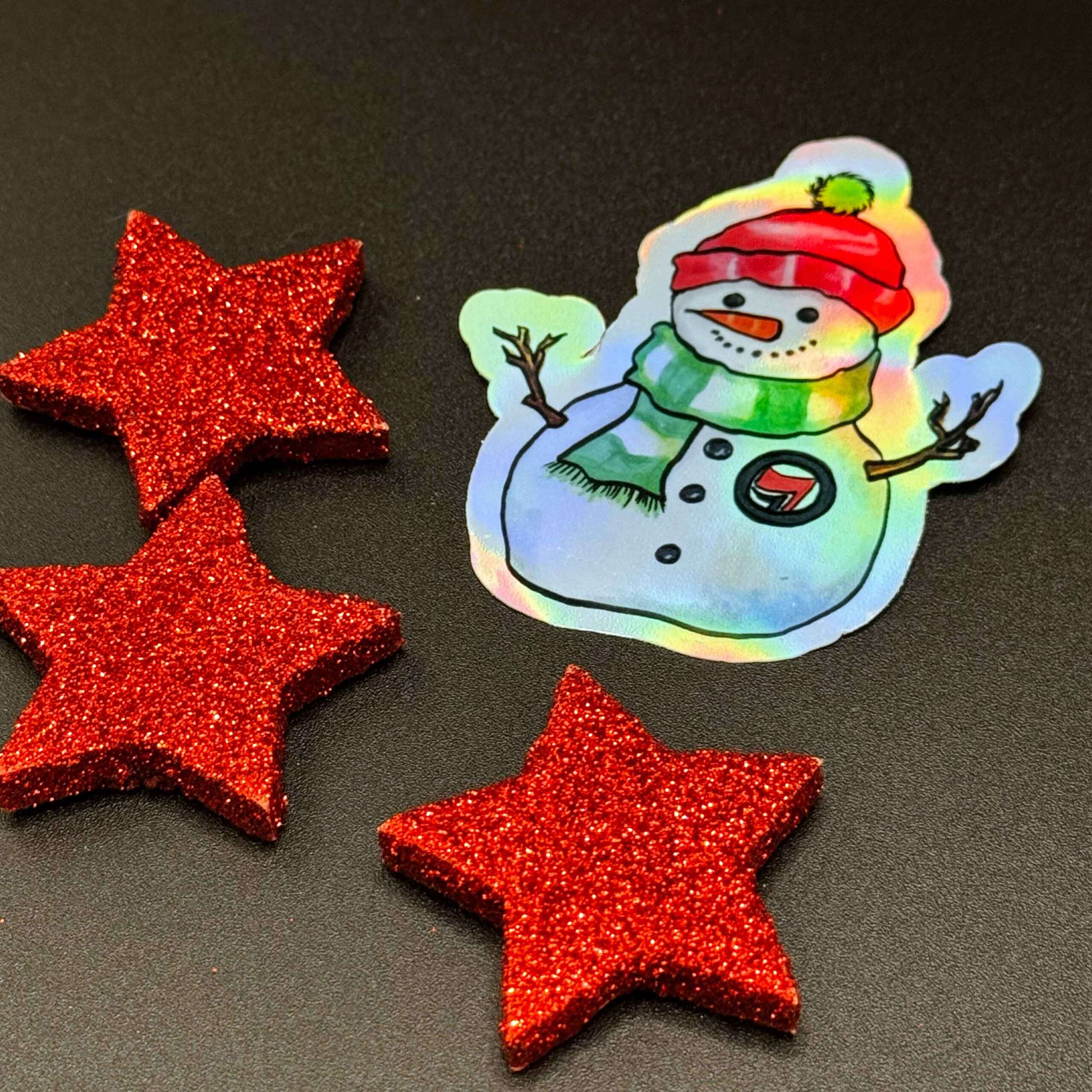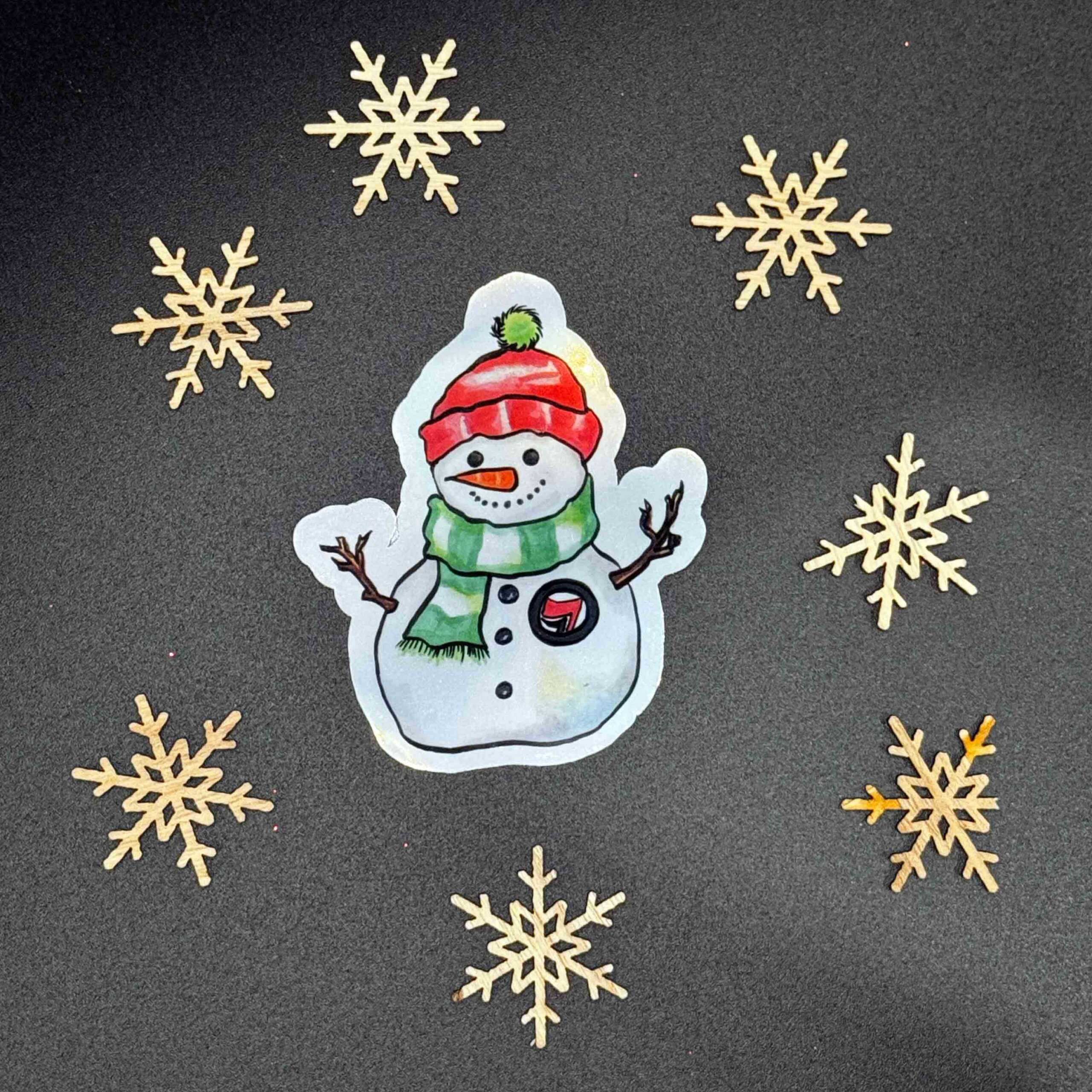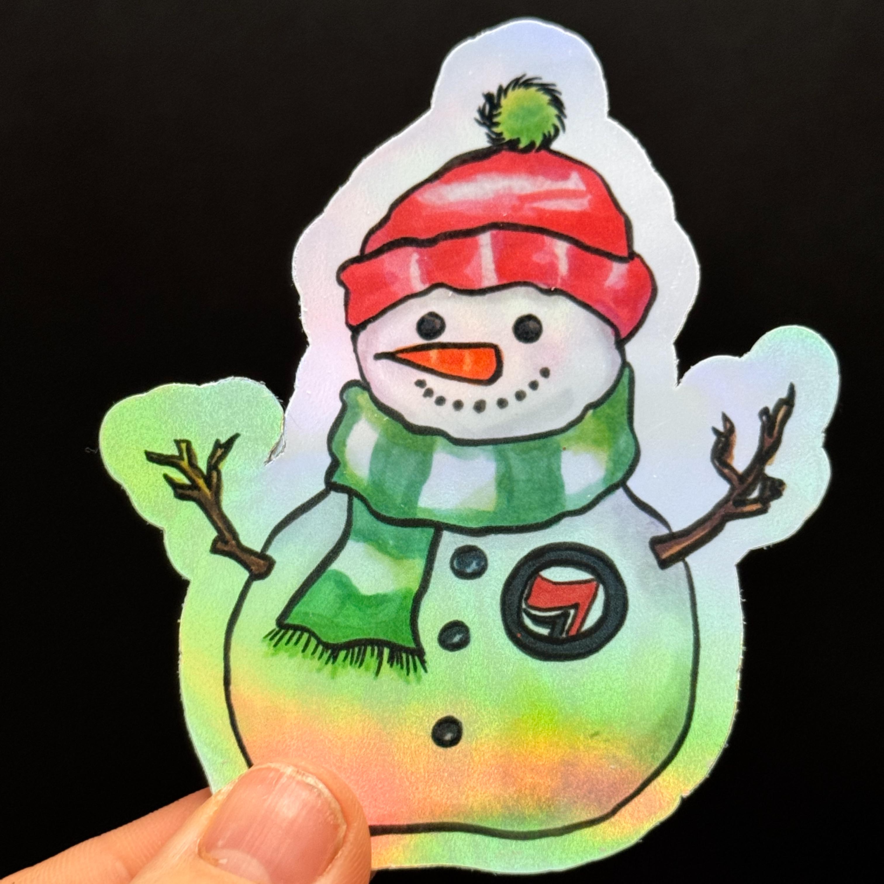 Dieser Antifa Schneemann Vinylsticker kombiniert winterliche Illustration mit klarer Haltung. Das Motiv zeigt einen fröhlichen Schneemann mit roter Wollmütze, grünem Schal und einem Antifa-Abzeichen auf der Brust. Die Originalillustration wurde von mir mit Alkoholmarkern auf Markerpapier gezeichnet, anschließend digitalisiert und auf holografische Vinylfolie gedruckt.
