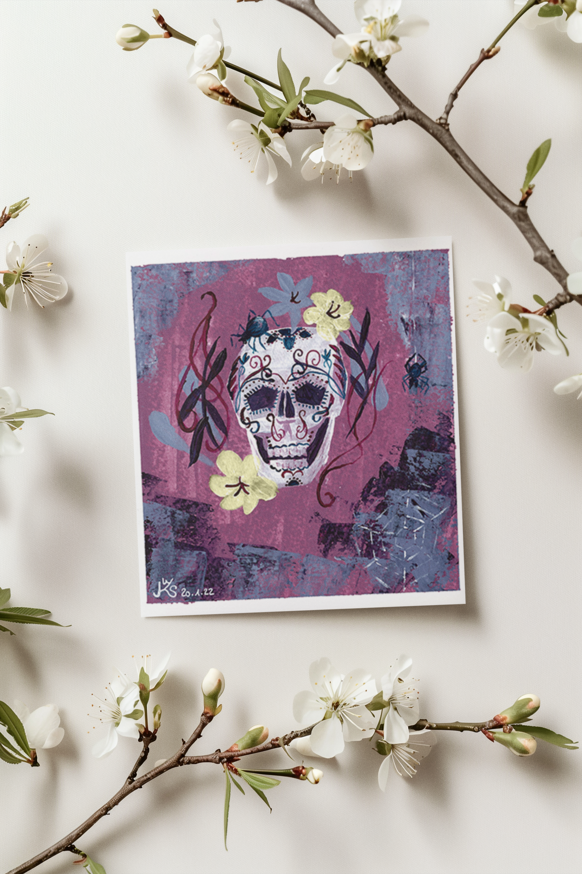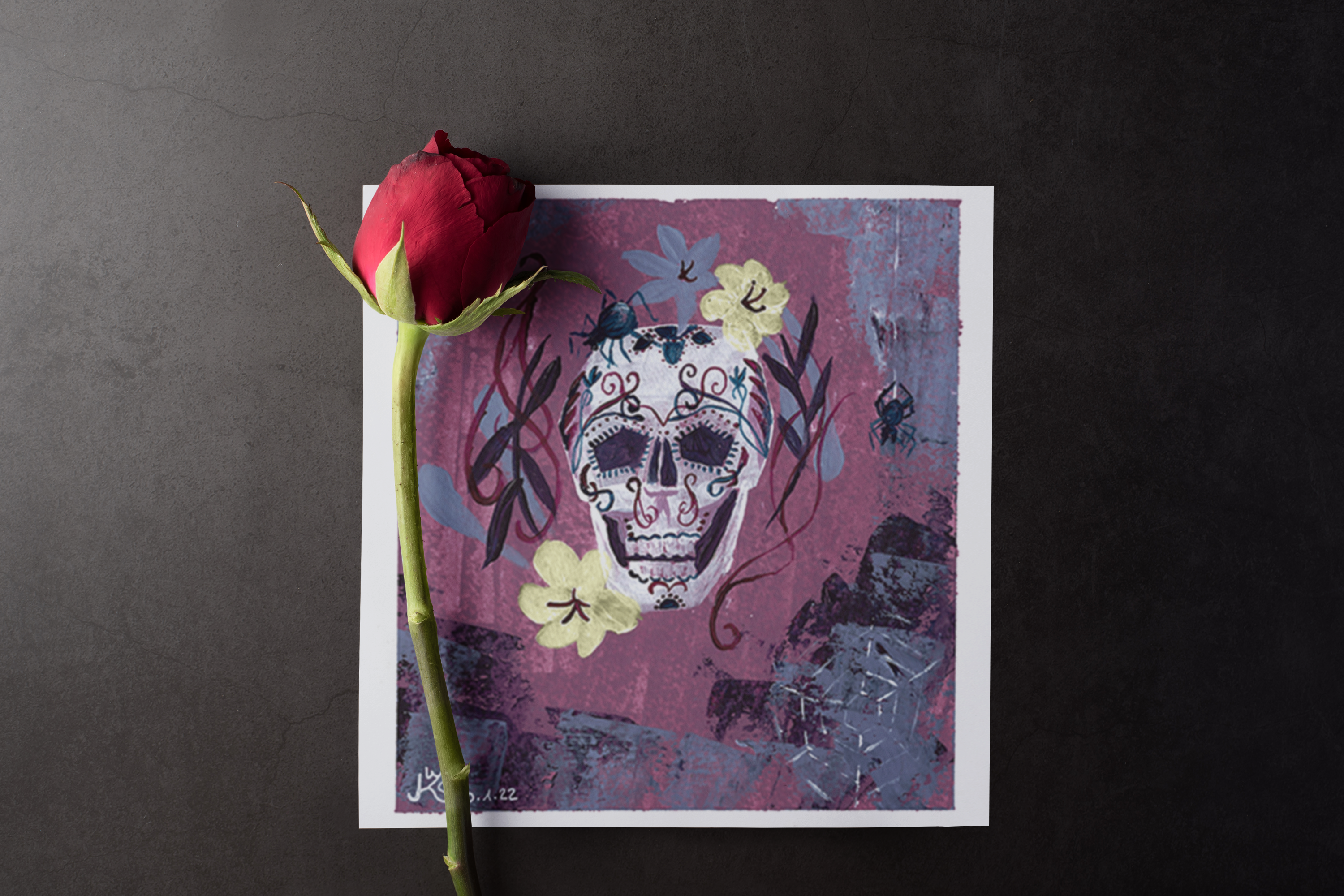Das Bild zeigt einen Candy Skull, typisch für den Dia de Muertos, den mexikanischen Tag der Toten. ist. Dieser Feiertag steht seit 2008 auf der Liste der immateriellen Güter des Weltkulturerbe der UNESCO.