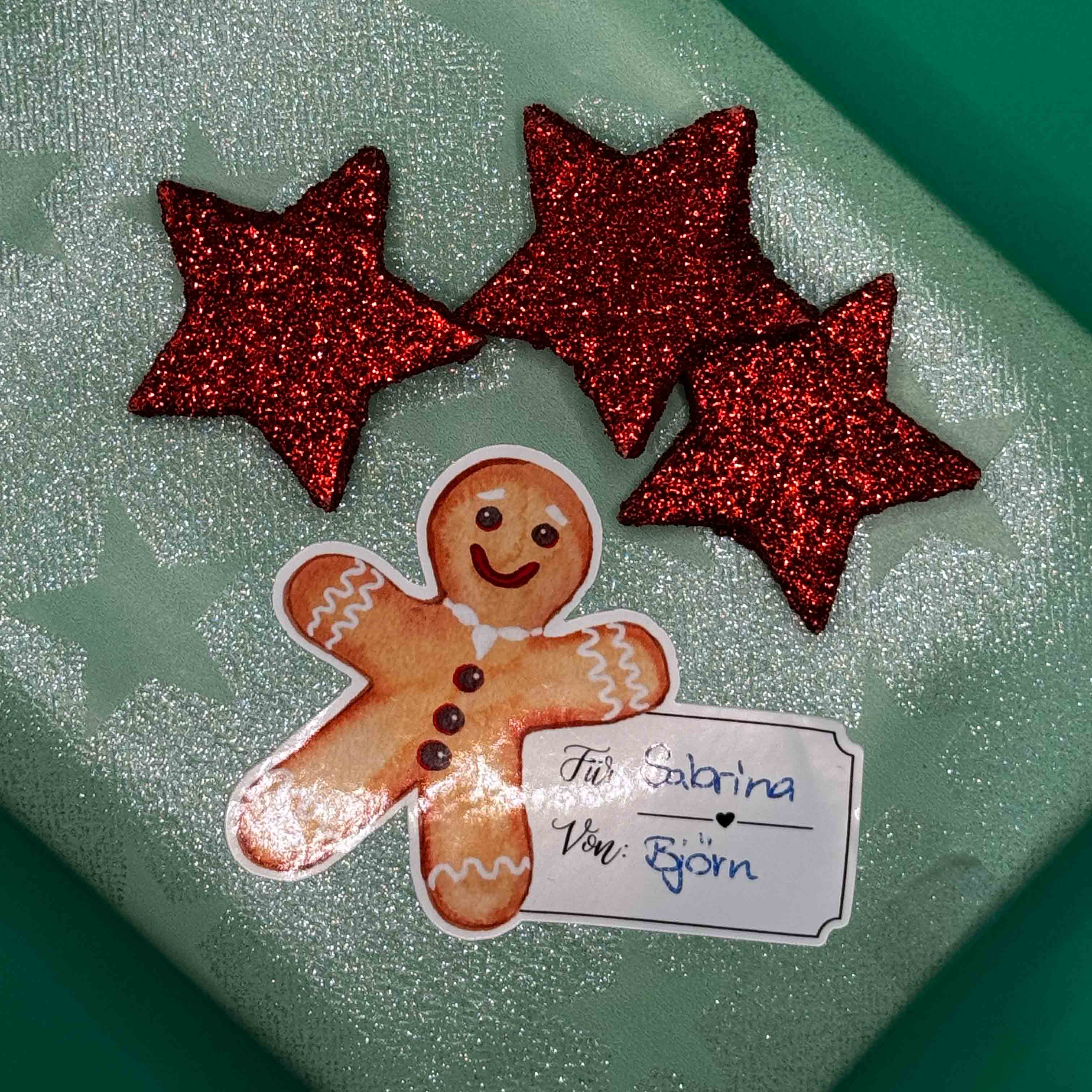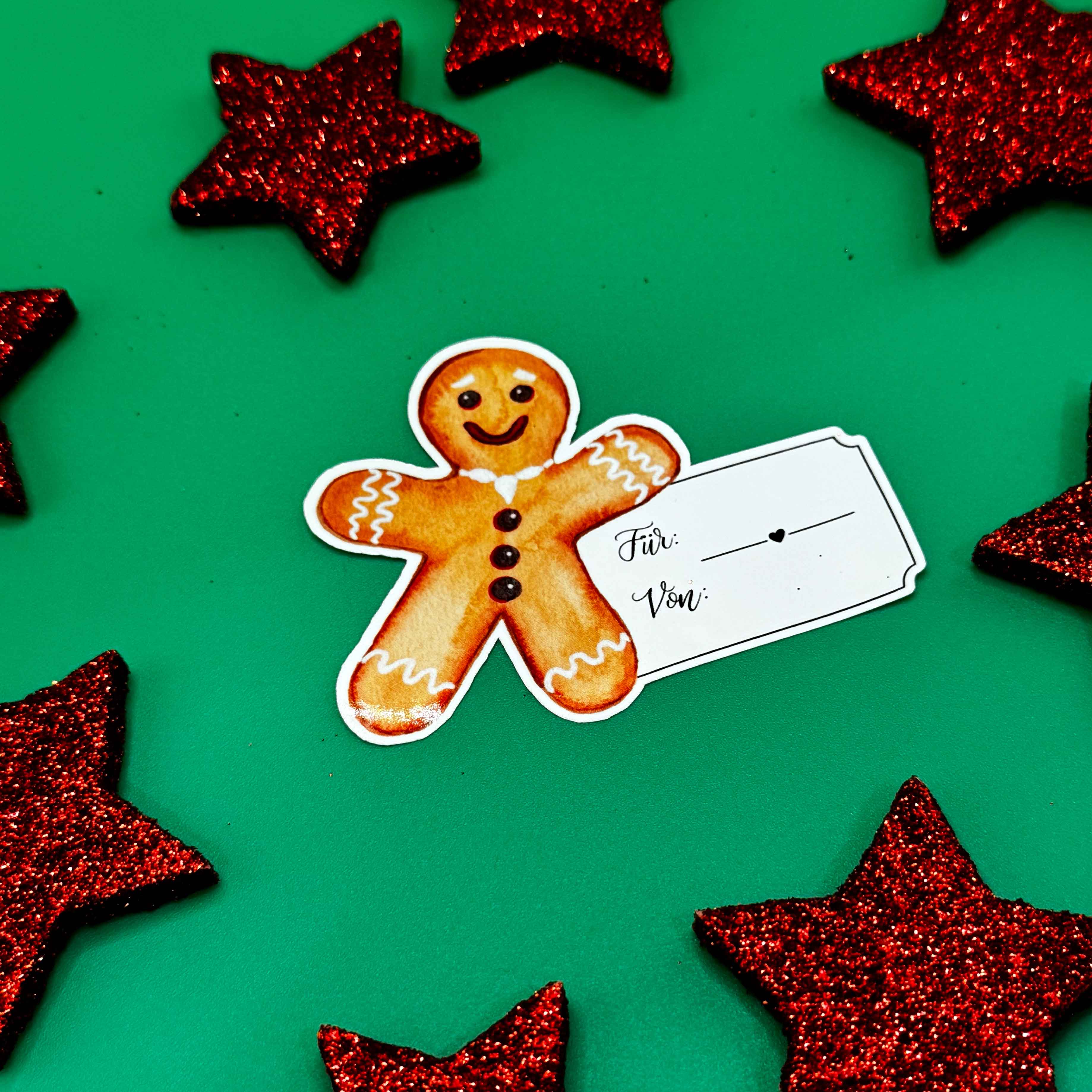 Dieses weihnachtliche Vinyl-Geschenketikett zeigt einen freundlich lächelnden Lebkuchenmann, hinter dem ein Etikett mit den Feldern „für“ und „von“ platziert ist. Das Motiv wurde von mir als Originalillustration mit Aquarellfarben auf Papier handgemalt, anschließend digitalisiert und als Sticker umgesetzt.