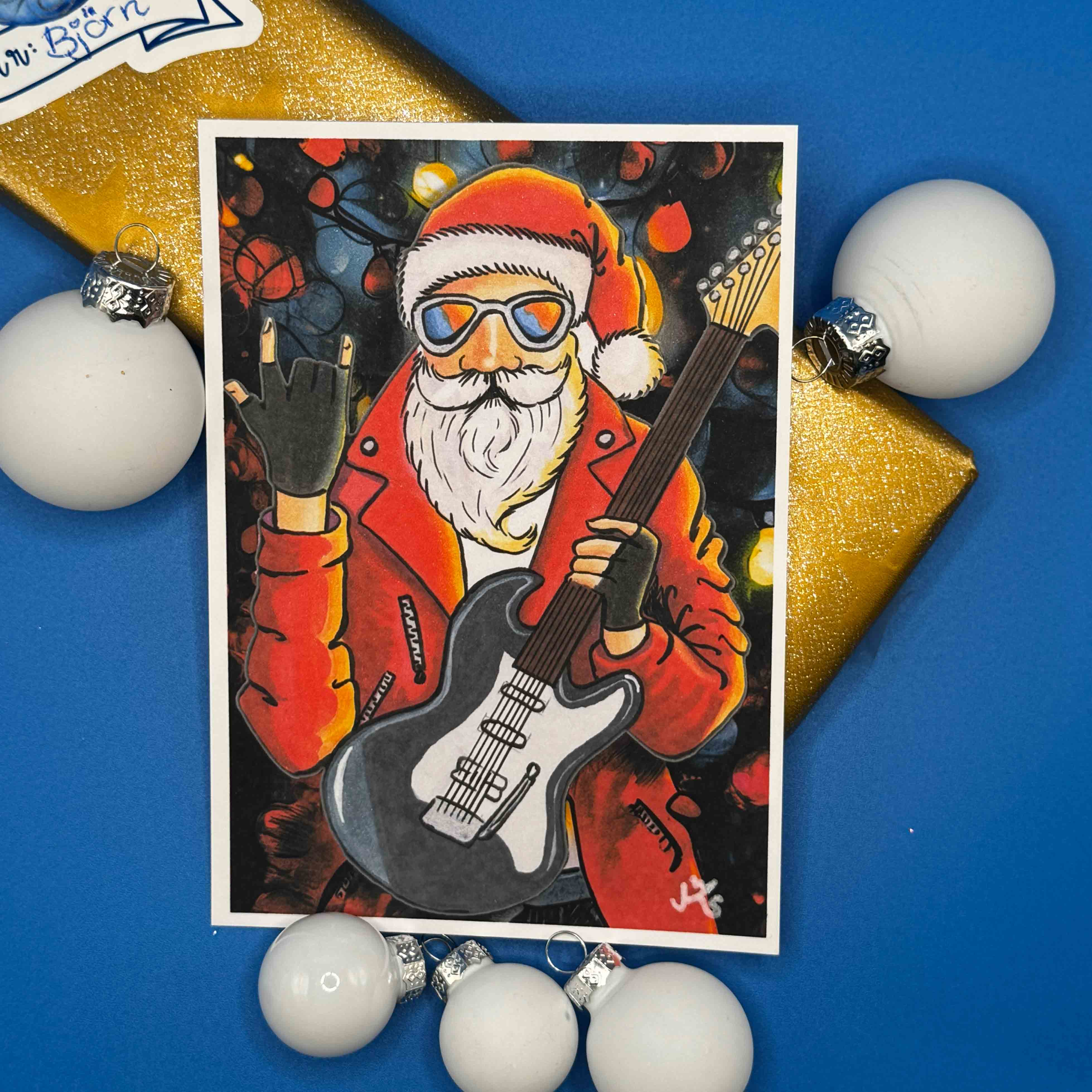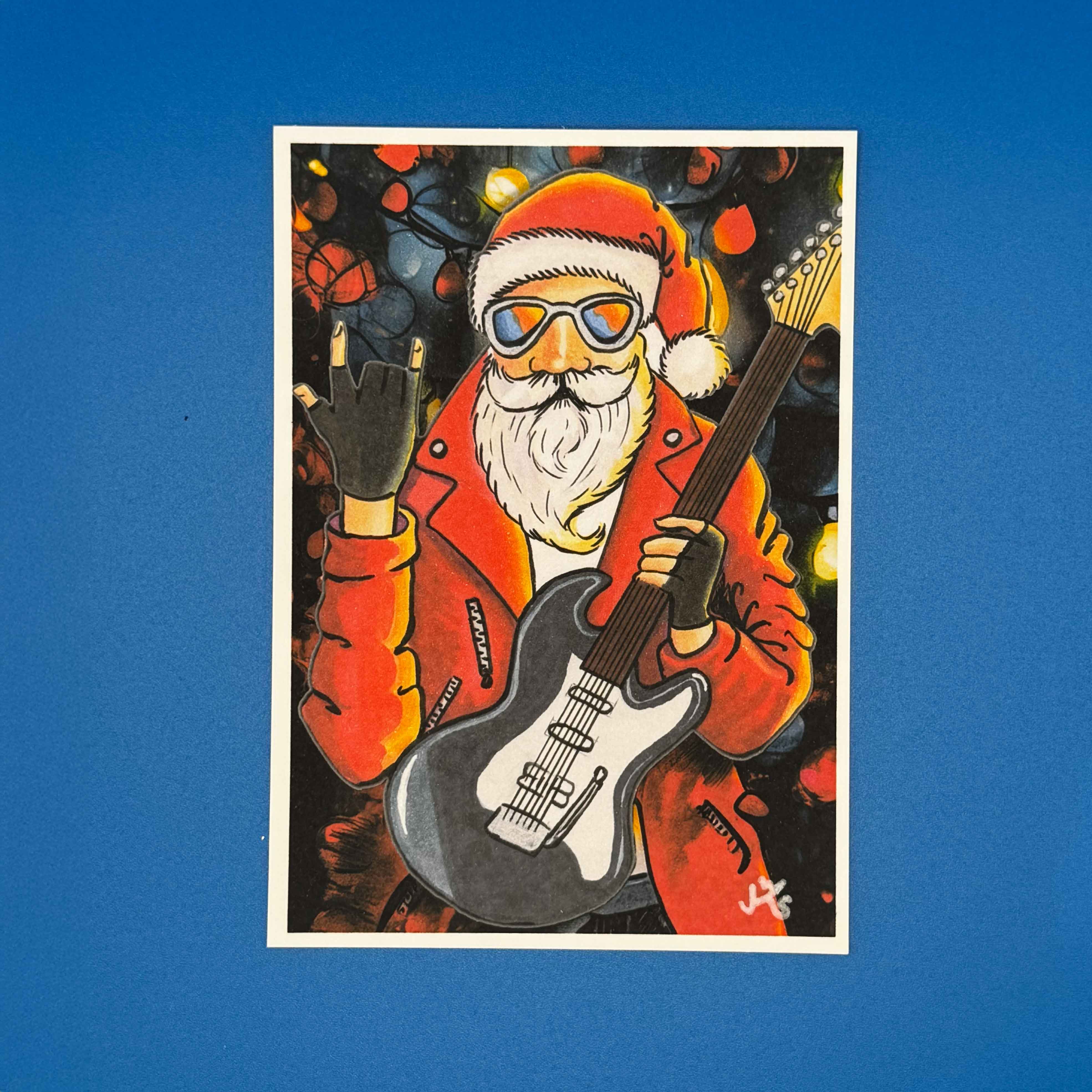 „Rocking Santa“ zeigt einen Santa Claus, wie man ihn selten sieht: Sonnenbrille auf der Nase, E-Gitarre in der Hand und der klassische Rockergruß in Richtung Weihnachten. Die Originalillustration wurde von Hand mit Alkoholmarkern erstellt und anschließend als hochwertiger 6-Farb-Tintendruck umgesetzt. Das Ergebnis: satte Farben, feine Details und ein Motiv mit ordentlich Attitüde.