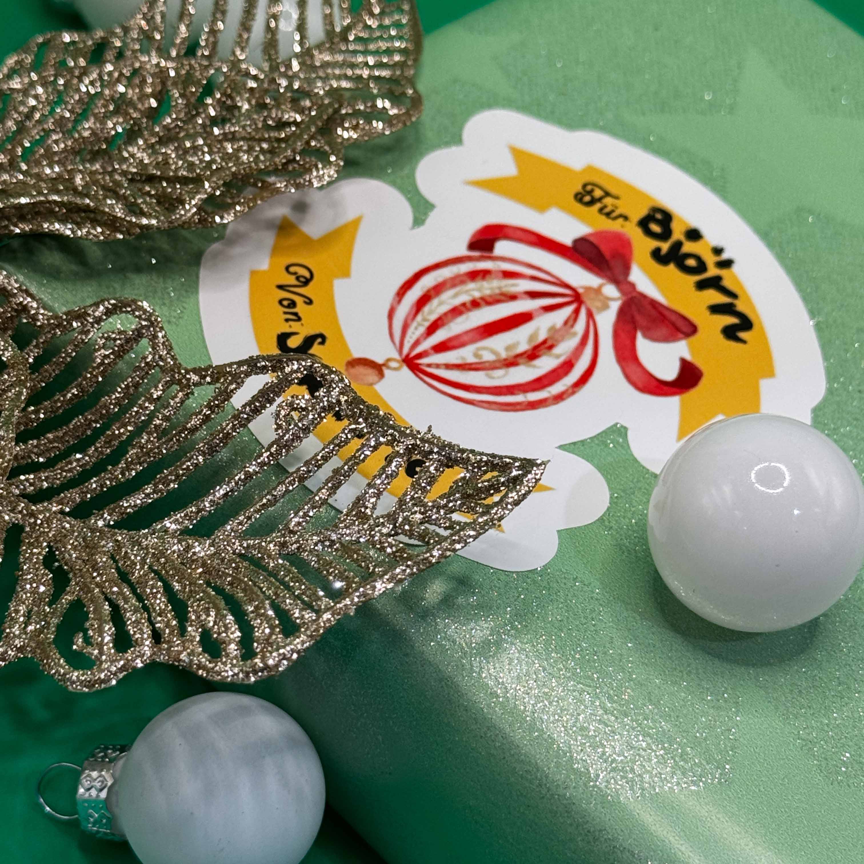 Das rot-weiße Weihnachtskugel Geschenketikett kann mit einem geeigneten Kugelschreiber oder Marker beschriftet werden und ist für glatte Oberflächen im Innenbereich vorgesehen. Ideal zur individuellen Kennzeichnung von Weihnachtsgeschenken.