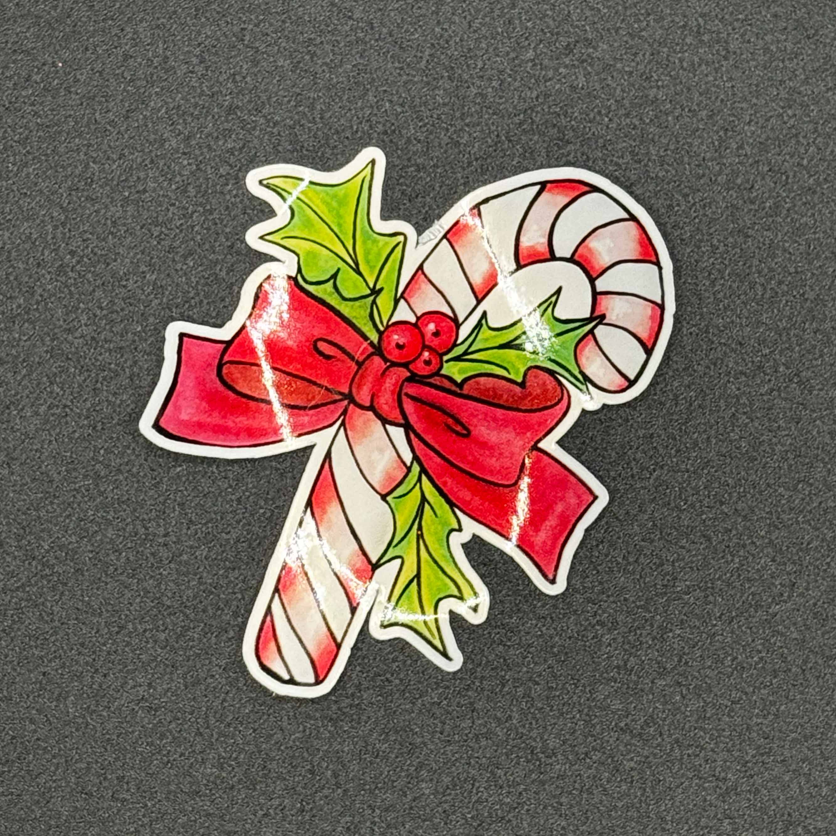Dieser Zuckerstange mit Stechpalme Vinylsticker zeigt eine klassische rot-weiße Zuckerstange, ergänzt durch Stechpalmenzweige mit roten Beeren und eine samtrote Schleife. Die Originalillustration wurde mit Alkoholmarkern auf Markerpapier erstellt, digitalisiert und auf weiße Vinylklebefolie gedruckt.
