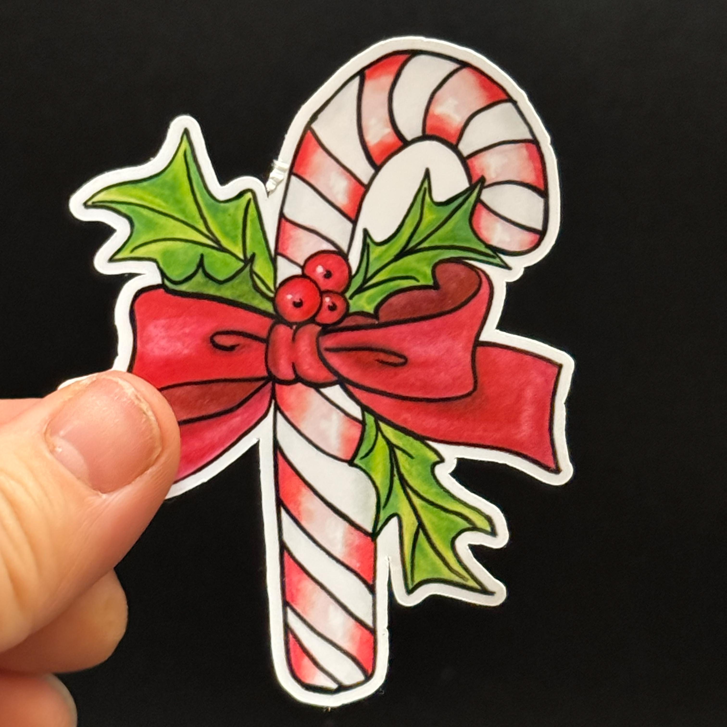 Zuckerstange mit Stechpalme Vinylsticker , ca. 7,5 × 6,5 cm (H × B), weiße Vinylklebefolie, Konturschnitt, Kunstdruck nach Originalillustration, handgefertigt, Lieferumfang: 1 Sticker
